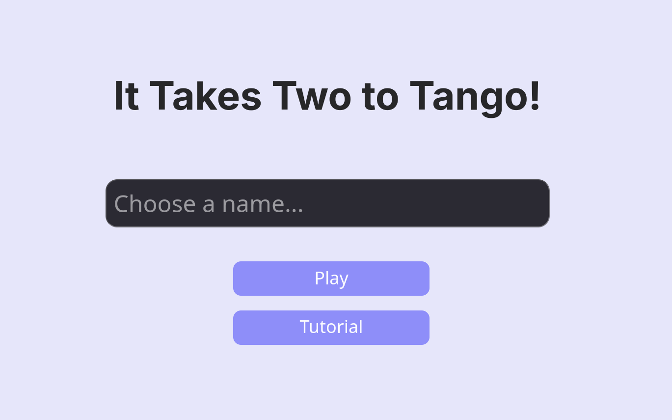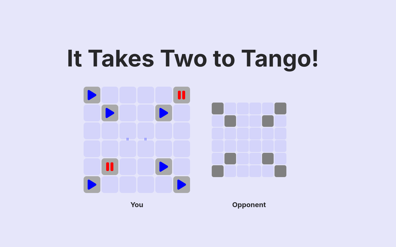 It Takes Two to Tango was our project for Royal Hackaway V8, the eighth annual 24-hour hackathon event hosted by the Royal Holloway Computing Society. The game is a real-time multiplayer browser game where two players face off to try to solve a Tango puzzle the fastest. The game features a display in which you can see the progress of your opponent compared to your own, which is updated in real time as you play. The first player to solve the puzzle is the winner.