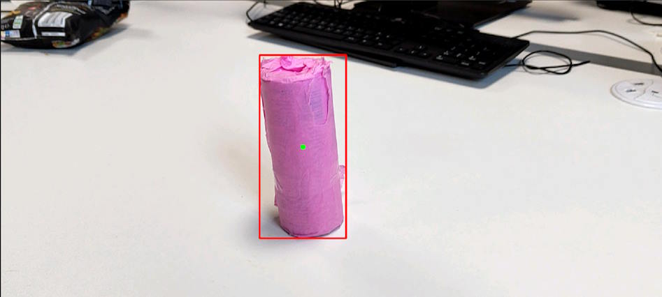 The app uses OpenCV to filter out colours other than the shade of pink it is calibrated for using the calibration mode of the app. It then takes the largest of the visible blobs of colour and sends the screen coordinates of its center to the robot over a Wi-Fi connection. The robot will then move left or right in order to keep the center of the can in the center of the camera, while moving forwards towards the can. Eventually, the robot detects the can touching the claw and closes, capturing the can.